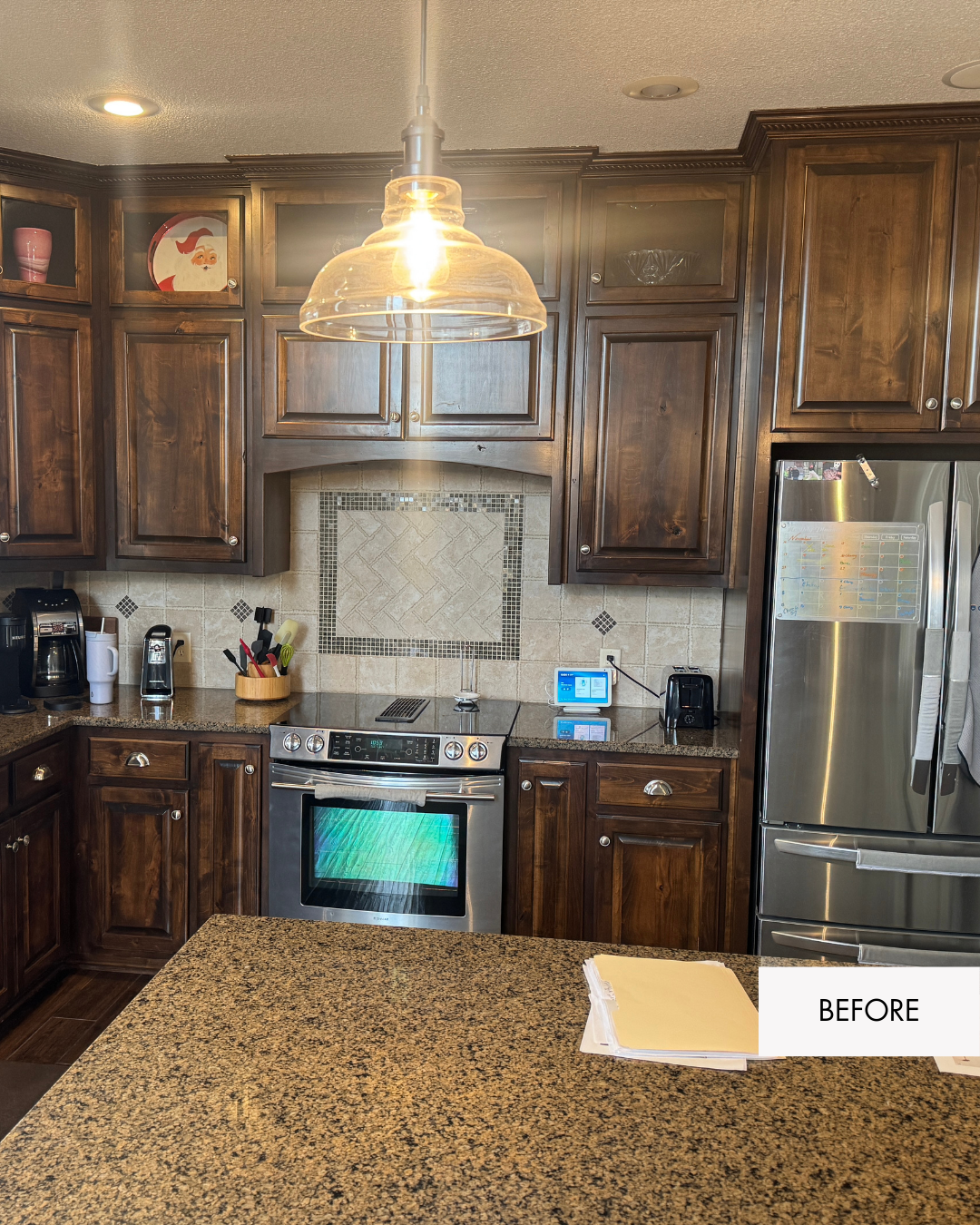 Before, this kitchen was filled with dark wood cabinets and a busy backsplash that made the room feel smaller. The homeowners dreamed of a brighter, more open design with timeless finishes.