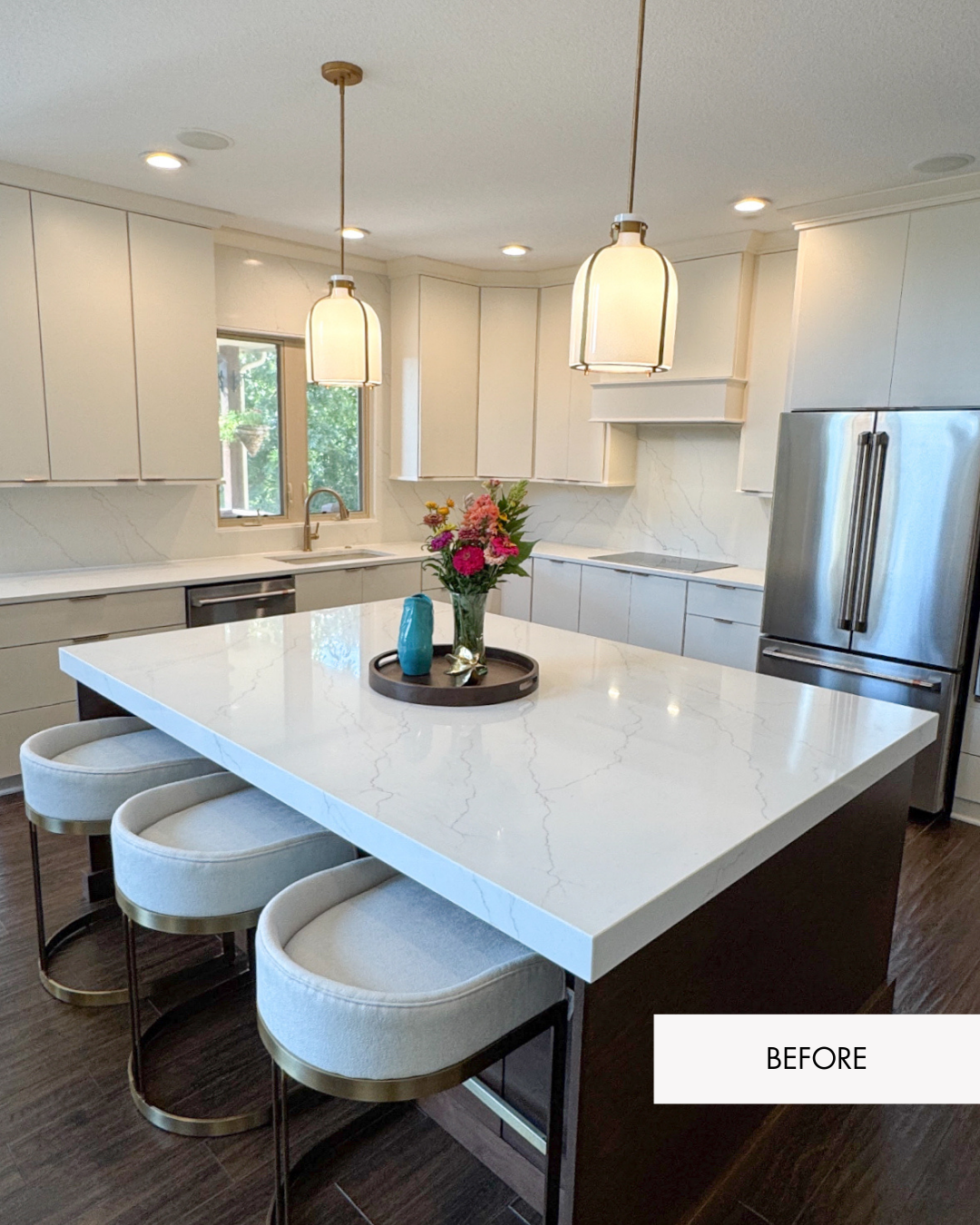 After the remodel, the kitchen is now anchored by a large quartz island with a thick edge detail, soft white custom cabinetry from Crown Cabinetry, and sleek brass light fixtures. The space feels fresh, minimal, and perfectly designed for family gatherings.